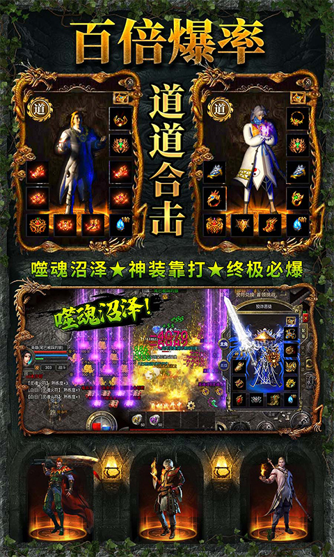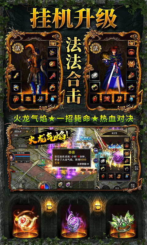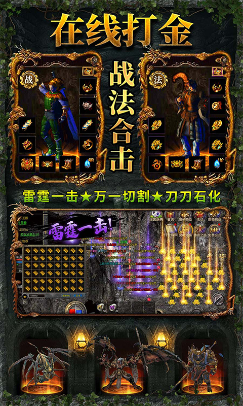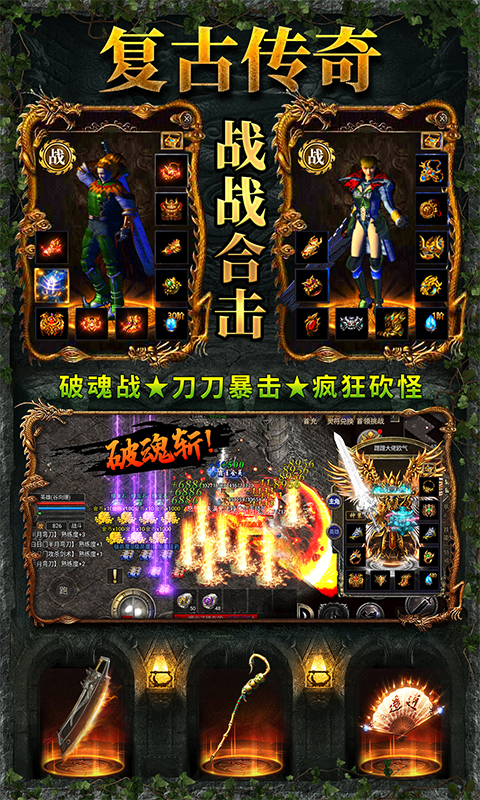 经典战法道三职业,主角和英雄自由组合,配合爆发合击技能伤害,重现三大职业六大合击辉煌时代。玩法核心传承经典,“升级、爆装、攻沙”为核心;同时热血升级新增跨服远征-荣耀竞技,精彩比拼,热血竞技之魂不灭;更多精彩玩法等你体验!